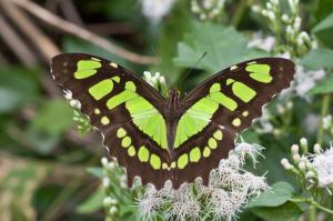 Тропическая красавица Siproeta stelenes обладает невероятной красотой — на её крыльях можно встретить все оттенки зеленого, от мяты до изумруда. Более романтичное название — Малахитовая бабочка — Сипроета Стелена приобрела благодаря черным, коричневым и оливковым вкраплениям, которые так напоминают полудрагоценный природный камень малахит. Внутренняя поверхность крыльев имеет нежный, пудровый окрас с вариациями оранжевого или красного. Правильный, гармоничный узор на крылышках делает эту бабочку настоящей звездой. Её танцующий полет при небольших размерах (всего 8–10 сантиметров) производит на зрителей завораживающее впечатление, а яркая окраска словно переносит на солнечный, жаркий курорт. Любоваться бархатными крылышками Малахитовой бабочки можно бесконечно, поэтому она станет идеальным подарком для романтической даты или другого важного праздника. Чаще всего эта бабочка встречается в Панаме, Центральной Америке и в северной части Южной Америке. Однако она с удовольствием живет и в домашних условиях, с радостью общаясь с хозяином. Кормить эту кокетливую малышку проще простого — подойдет любой сочный фрукт, например, апельсин.