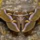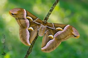 Samia Cynthia (Шелкопряд Айлантовый) – бабочка из вида павлиноглазок. Средний размер взрослой особи – 10-12 см. Человек использует гусениц этой крылатки для получения шелка. Но вид этой бабочки не является одомашненным, как, к примеру, Шелкопряд Тутовый. Место обитания обширно – Китай, Малайзия, Индия, Филиппинские острова и Япония. Крылья раскрашены в приглушенные, мягкие оттенки. Они бархатистые и переливаются перламутрово-серебристым блеском и золотисто-розовым мерцанием. Тельце насекомого тоже мохнатое, а милые усики придают ему еще большее очарование. По размеру представители этого вида достаточно крупные, а период их жизни продолжается до 4-6 дней. Образ жизни этой крылатки ночной.
